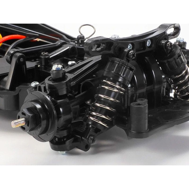 - Without removing battery pack, motor, and R/C equipment setups from the center frame, simply change attachment directions of final gears and steering linkage to switch between front- and rear-wheel drive; front (FR) or midship rear (MR) motor position can be chosen for rear-wheel drive cars. (Six setups are available in total.)