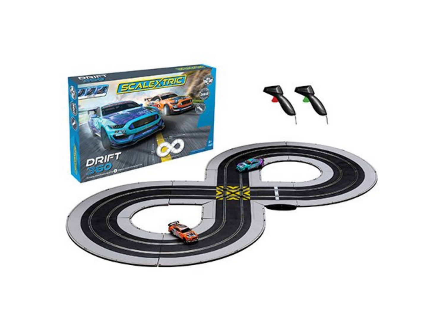 Race two Ford Mustang GT4 cars around a figure of eight track in this Drift 360 race set. Take on your opponent in a full-on, door bashing, side-by-side duel but watch out at the crossroads where you can make a 180 or 360 turn to confuse your adversary and impress the spectators by drifting into the bend and power sliding out!
