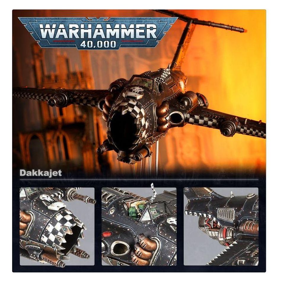 Propelled by a single, massive jet engine, the Dakkajet roars through the sky. Gunz blazing a near constant stream of bullets, tormenting fleeing infantry or enemy aircraft. Dakkajet pilots believe firmly in quantity over quality, and commonly bolt as many big shootas as possible to their aircraft - some of those bullets are bound to hit the target.