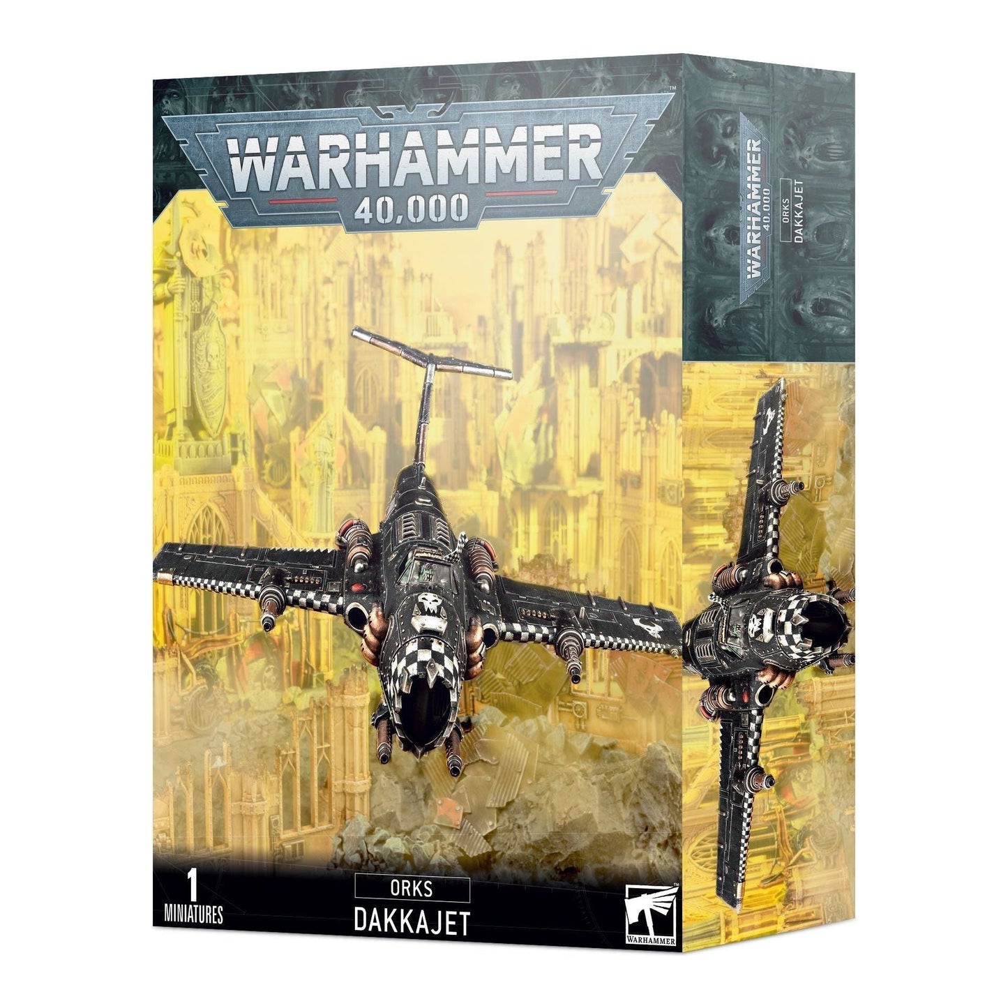 This multi-part plastic boxed set contains the components necessary to build one Dakkajet. As well as a Grot Gunner, it includes a range of weapons options: a big shoota, boom bombs, burna bombs, skorcha rokkits and supa shootas, as well as an Ork transfer sheet.