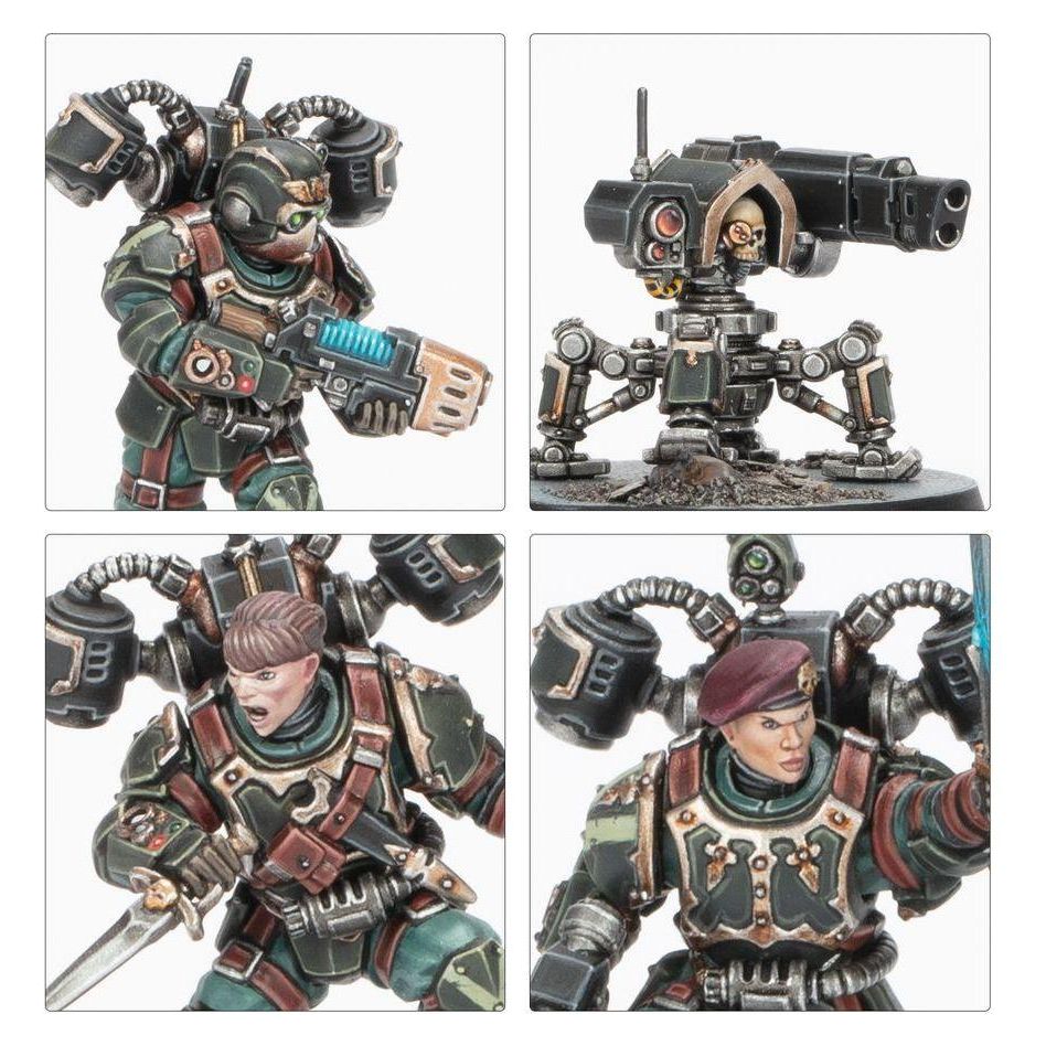 This multipart plastic kit builds 10 Tempestus Aquilons and a servo-sentry for use in games of Kill Team, or fielded in an Astra Militarum army in games of Warhammer 40,000. The kit includes options, accessories, and interchangable parts to customise your kill team, plus components to build specialists like the quick-drawing Gunfighter, explosive Grenadier, and servo-sentry, which can be armed with a flamer, grenade launcher, or a hot-shot volley gun.