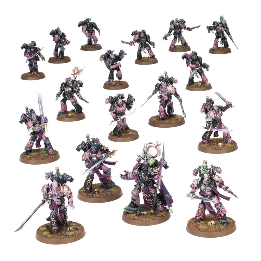 This box contains 17 plastic miniatures that represent a complete Callous Blades force for use in Combat Patrol games of Warhammer 40,000. It's an ideal way to start an Emperor's Children army, or easily add to an existing collection, and save money compared to buying the contents separately.