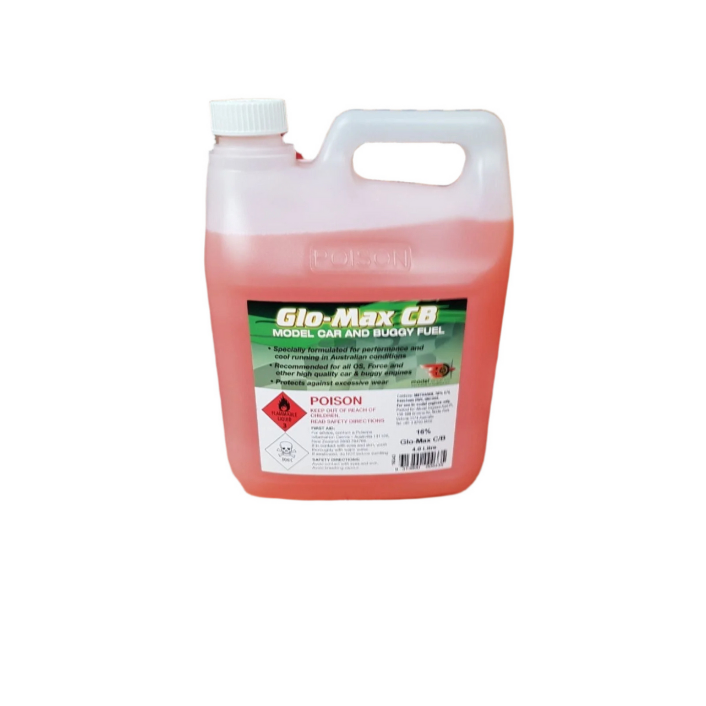 The RC (DG) GLO-MAX CB FUEL 16% NITRO 4 LT is a radio-controlled (RC) model car and buggy fuel, specifically designed with a 16% nitro (nitromethane) content, packaged in a 4-liter (LT) bottle. This fuel is formulated to provide enhanced power and efficiency for hobbyist and competitive RC engines, featuring a blend of oils and additives to protect against wear and tear and prolong the life of RC components.