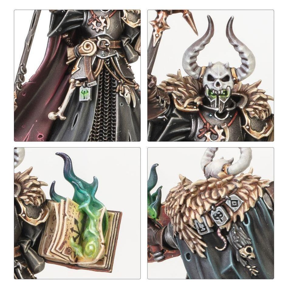 Armed with a sorcerer staff and runeblade, Tzarketh is clad in armour and furs that are scattered with talismans and trinkets that distinguish him as a shaman. He also carries a baleful tome filled with cursed words from which flames billow.