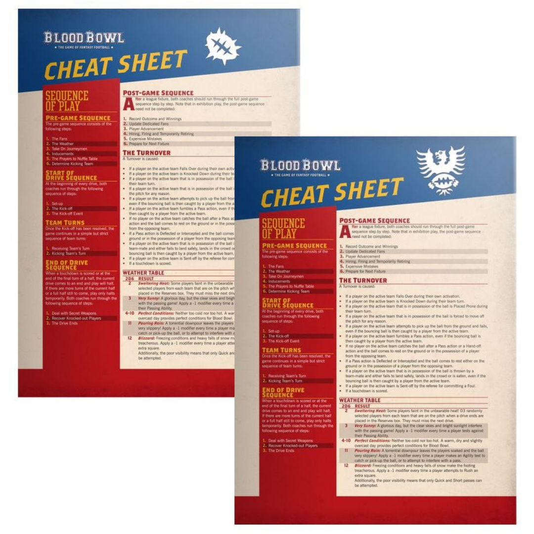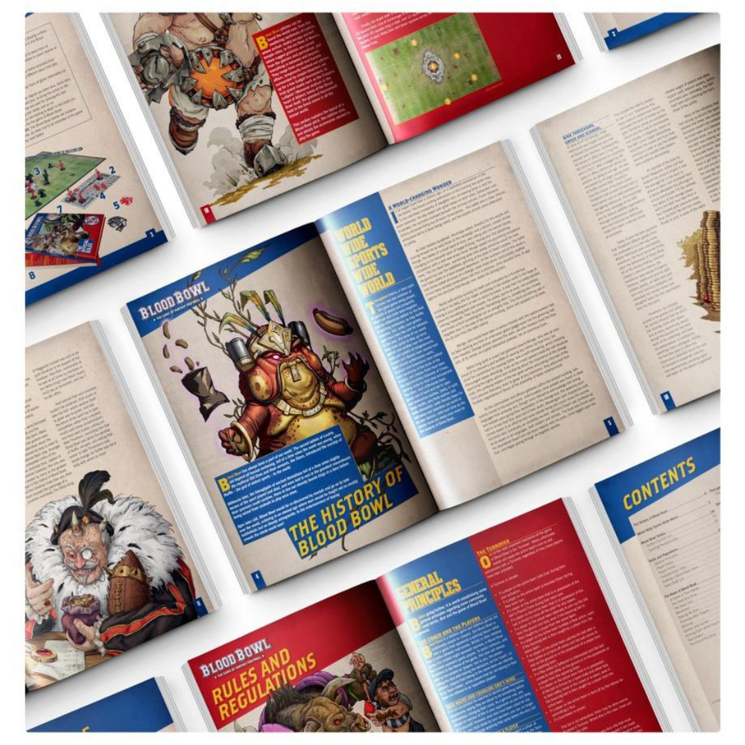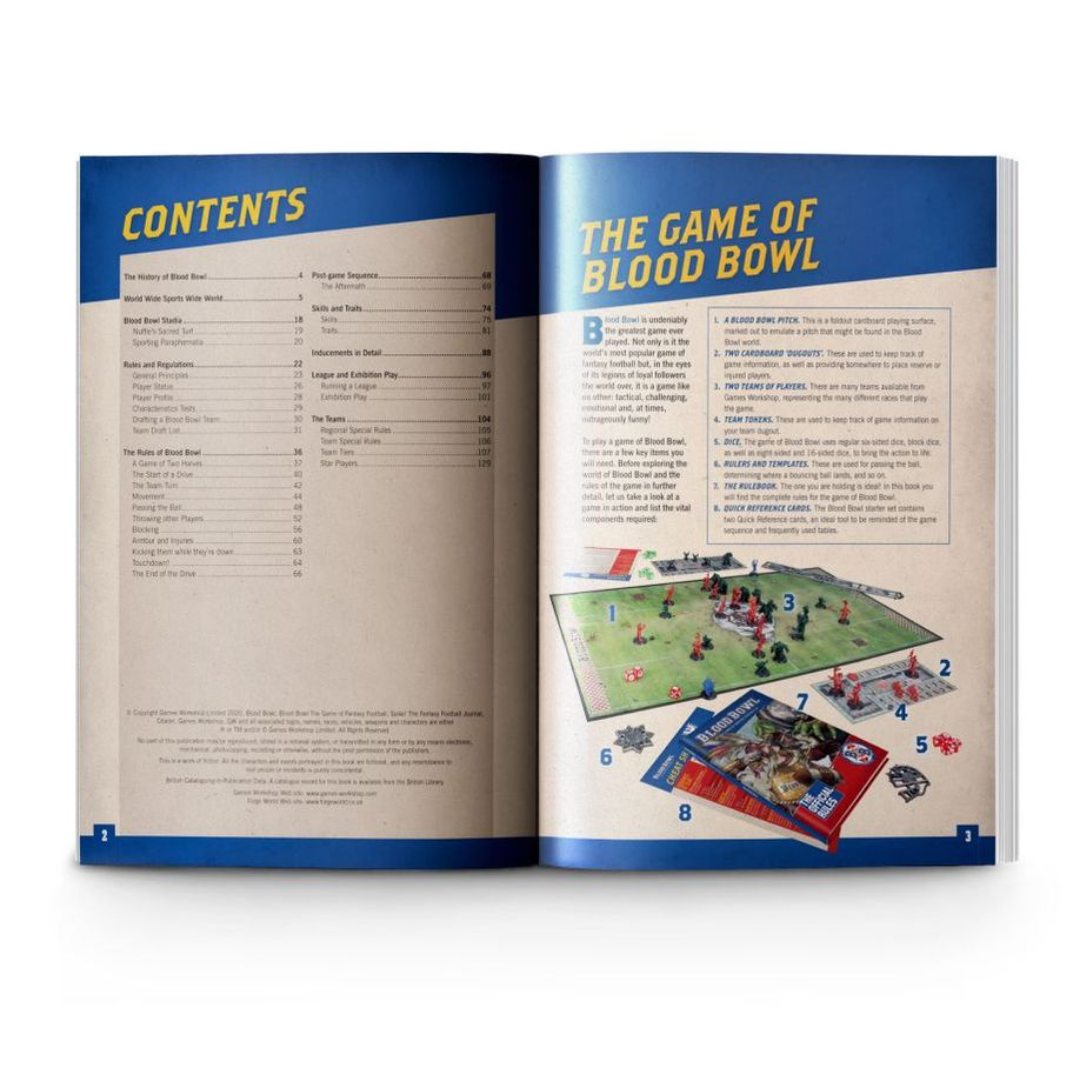 – A beautiful 136-page hardback Blood Bowl rulebook explaining the rules of the game, how to run a league and develop your team, plus updated team, player, and Star Player profiles for every team released so far.