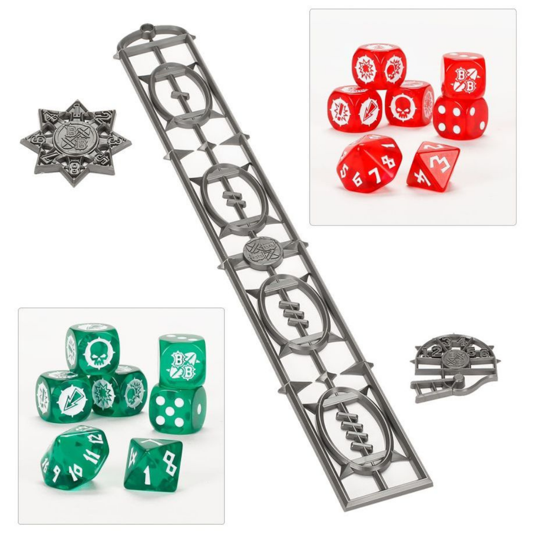– 2 full sets of Blood Bowl dice: one in red for the Humans, and the other in green for the Orcs