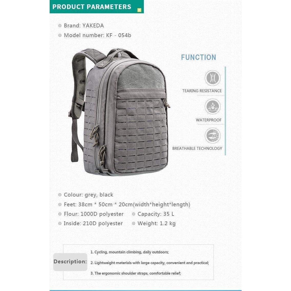Yakeda Backpack 35L size. A high quality tear resistant, waterproof bag with breathable technology. This backpack features an S shoulder Strap system. This provides better loose shoulder pressure, making it easier to bear a full backpack.